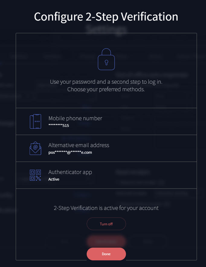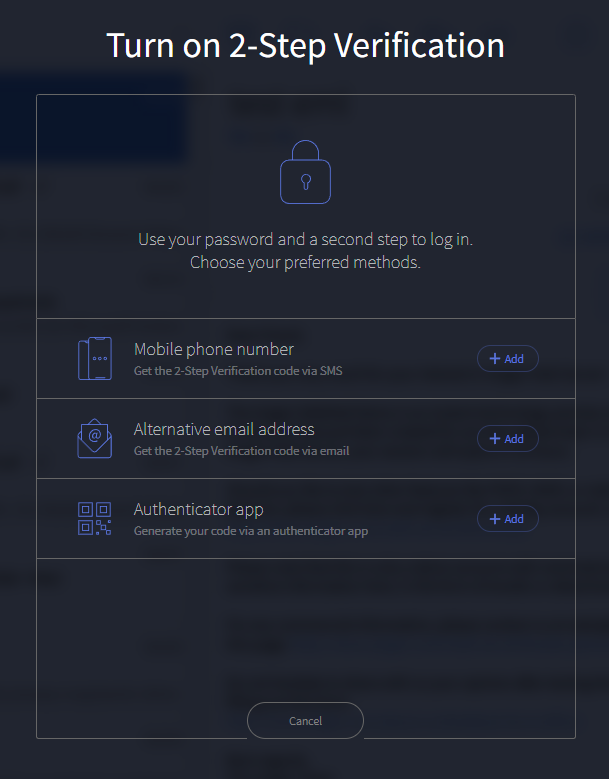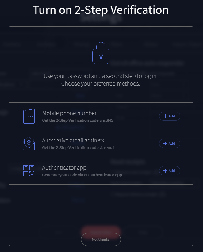After hitting the "Turn on" button, a modal dialog will be shown, giving the user a few details about 2-Step Verification options.
