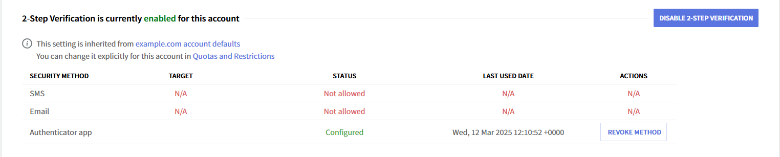 Configuring 2-Step Verification at Account Defaults level (default account class of a domain):
