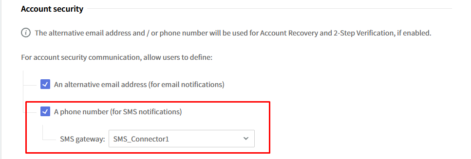 For the SMS to be available as an additional 2-Step Verification method, an SMS connector is mandatory to be defined and assigned to the domain default account class.