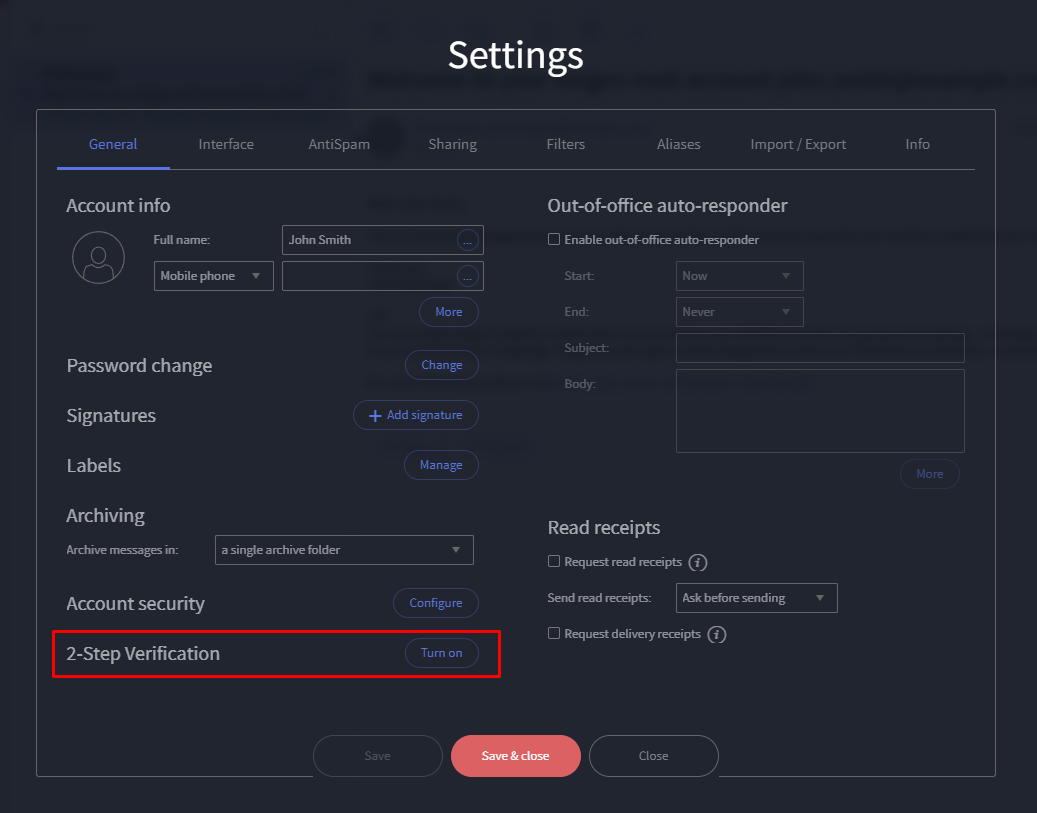 After filling in the field and clicking the "Next" button, 2-Step Verification will be turned on, and the user can return to the WebMail interface.
