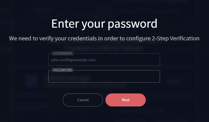 If 2-Step Verification activation is optional, after clicking on the "+ Add" button next to an available method, the user will first be required to verify credentials. In this example, the “Authenticator App” has been chosen.