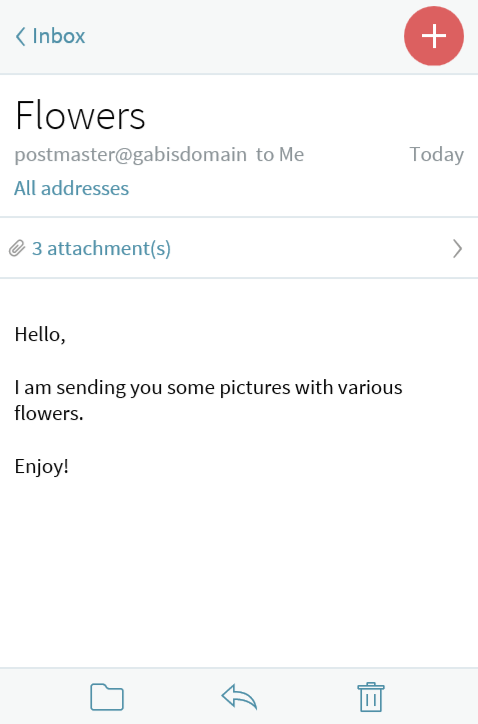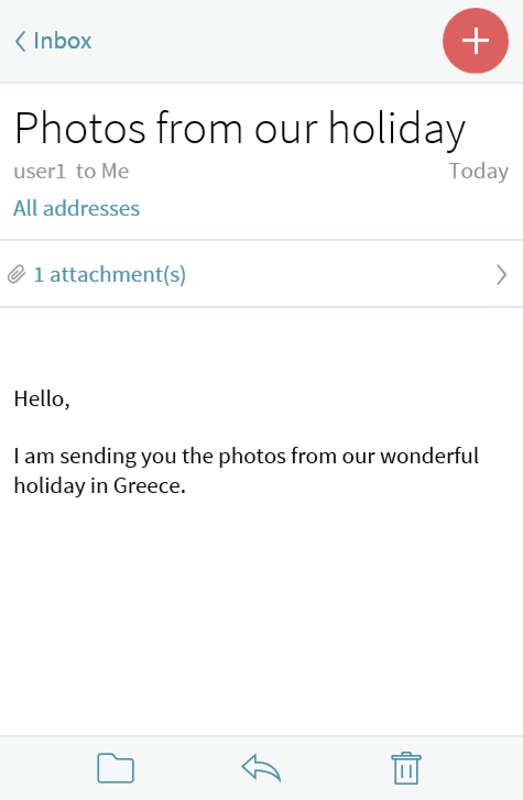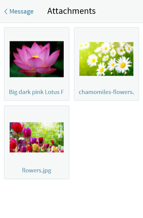 Select the "[x] attachment(s)" link to display the files attached to the current message. They are displayed two per line with previews (thumbnails) for the GIF, JPEG and PNG image formats. Click on the attachment name to open or download the file on your mobile device, so you won't have to login to your email account in order to access it.