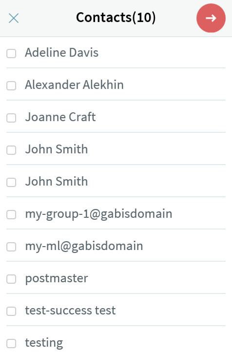 Select one or more contacts by ticking the check-box in front of each contact. Clicking on a contact link returns to composing the email and adds the email address of that contact to the specific field ("To", "Cc" or "Bcc").