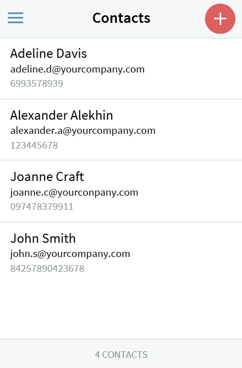 To create a new contact, tap on the "+" in the contacts list page and fill in the details ("First Name", "Last name", "Email address" and "Phone"). Choose "->" to save or "X" to cancel.