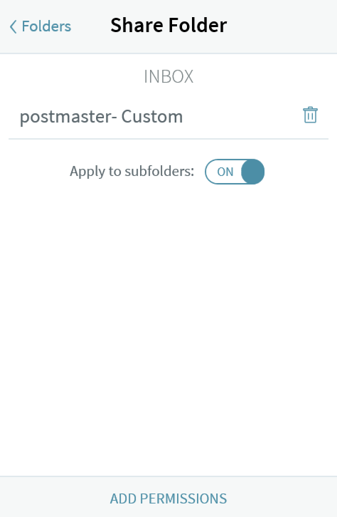 To control a folder's sharing permissions, access "All email folders" in the main window and select the spanner-shaped icon next to the folder name. When accessing this section, a list of the already defined permissions is displayed. If no permission has been previously set, the list will be blank.