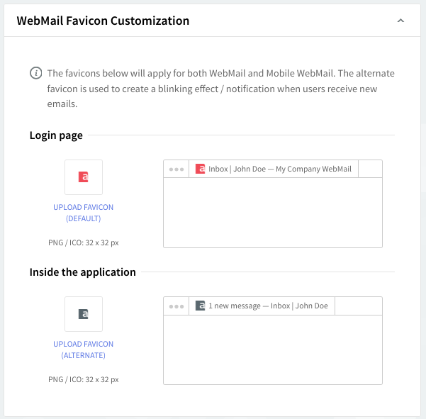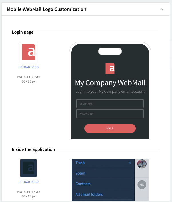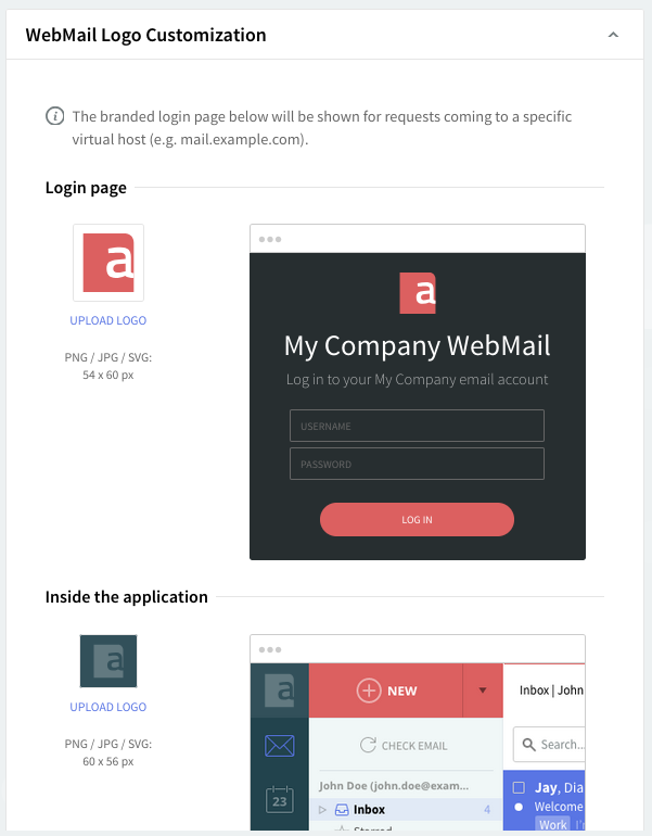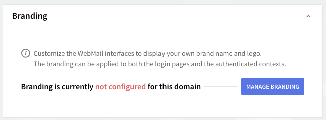 This section allows you to customize the appearance of the WebMail for each domain, by uploading & configuring a set of brand elements that will be used instead of the default ones. The brand elements are the brand name and a set of logos that will be displayed by the WebMail interface, available to the users of that domain.
