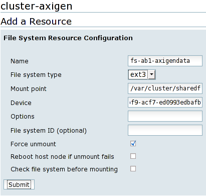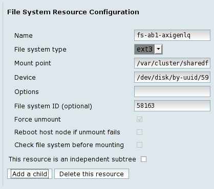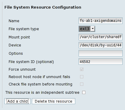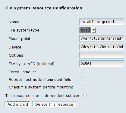 Each shared storage partition must be configured as resources in the cluster. To achieve this, you have to add each one of them as File system resources. Naming a resource is also important in order to ease performing future cluster administrative tasks, so you have to choose their names to be self explanatory and consistent.