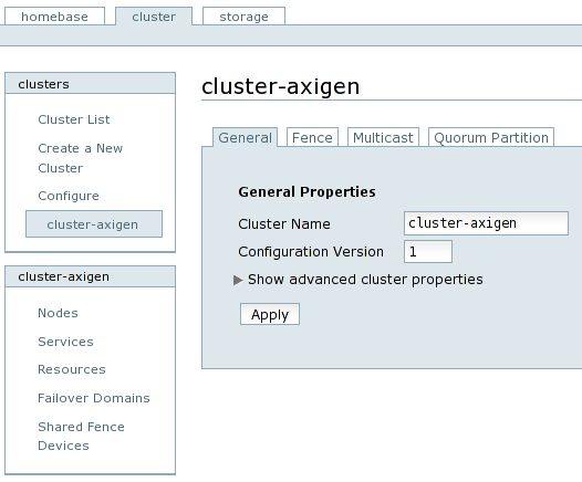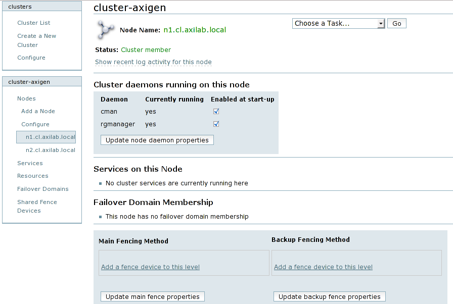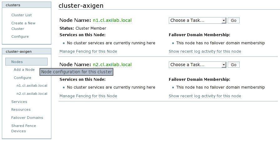 In order to start configuring your browser, type the Conga interface address into a browser: https://n1.cl.axilab.local:8084. Login using the admin username and the password you have previously set in the previous luci configuration section.