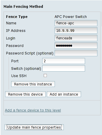 After adding the shared fence device, it must be attached for fencing all nodes. To achieve this, click on the Nodes option from the cluster name left menu and then on each node's entry form the Configure submenu. Clicking on the Manage fencing for this node link will open the node configuration page. Click the Add a fence device to this level link from the Main fencing method panel. From the drop-down list, select the shared fencing device you have previously configured, under the Use an existing fence device option. Fill in any additional parameters, like the switch port or anything else that is requested by the fencing device to recognize this specific node. Click on the Update main fence properties button, confirm the fence addition and wait for the cluster configuration to be updated.