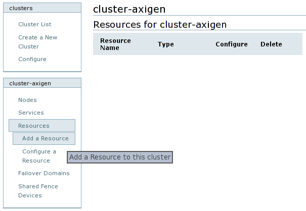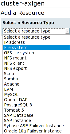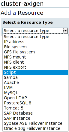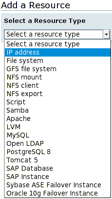 Each resource can be added by clicking on the Resources entry from the cluster name menu and then on the Add a Resource option. Then you must select the resource type from the drop-down list and configure it as explained below.