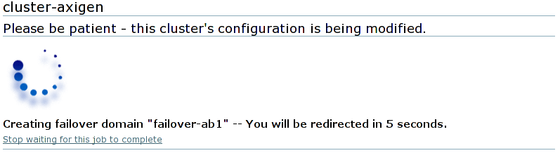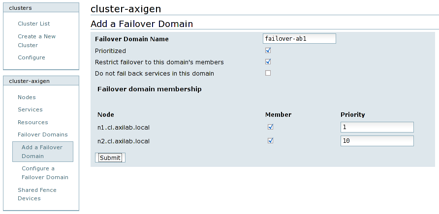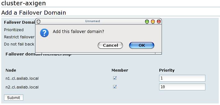 At the end, click on the Submit button, confirm the failover domain addition and wait until the cluster configuration is modified.