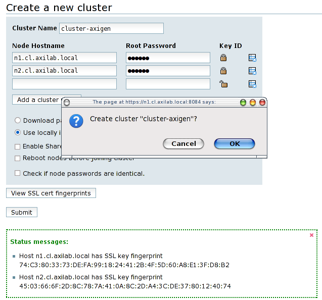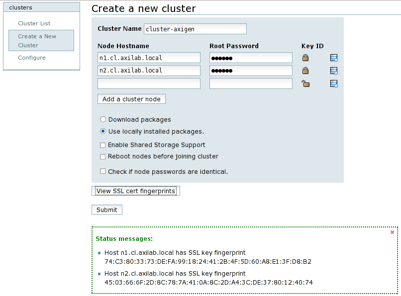 Press the View SSL cert fingerprints and the informational panel should appear at the bottom of the page. Click the Submit button and confirm this action to begin the cluster creation. At the end, the cluster configuration will be displayed.