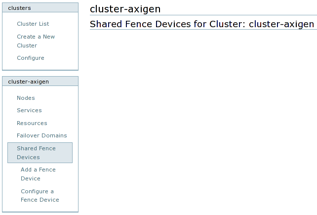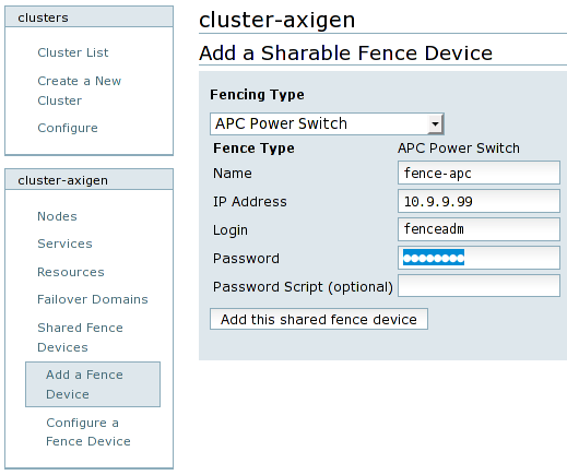 Next step is to configure the cluster fencing, by adding a fence device. To add a fence device, in the cluster name left menu, click on the Shared Fence Devices menu and choose the Add a Fence Device option from the expanded submenu. Then, choose your fence device from the drop down options list and configure its parameters accordingly. Name the shared fencing device properly, like fence-type, for example fence-apc for an APC Power Switch.