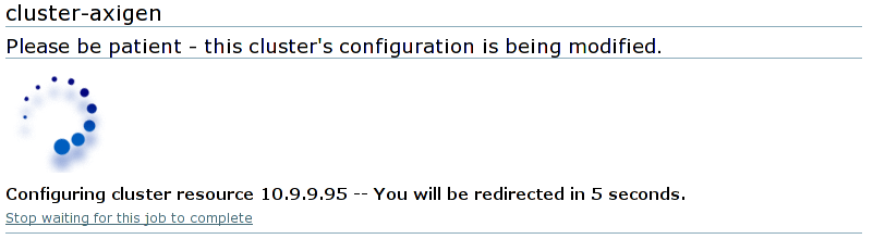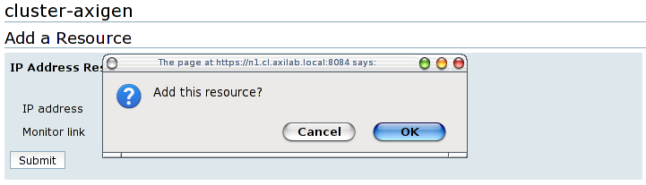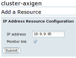 The IP address resource represents the failover domain floating IP address. Fill this IP address and check the Monitor link option. Click on the Submit button, confirm the resource addition and then wait for the cluster configuration to be completed.