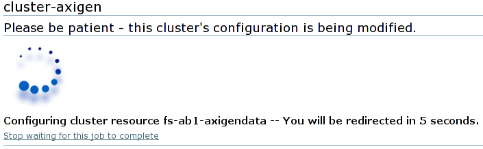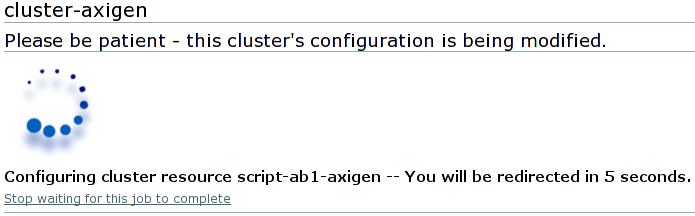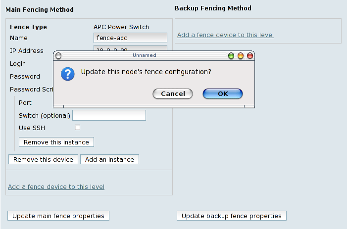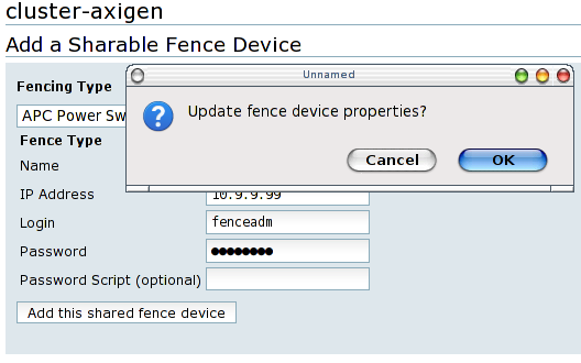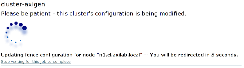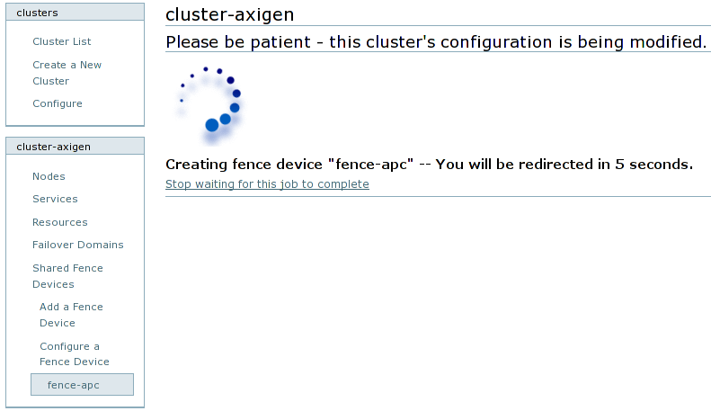 After you finish setting up parameters for the fence device, press the Add this shared fence device button. A confirmation window will appear. Confirming will show the progress screen for updating the cluster configuration.