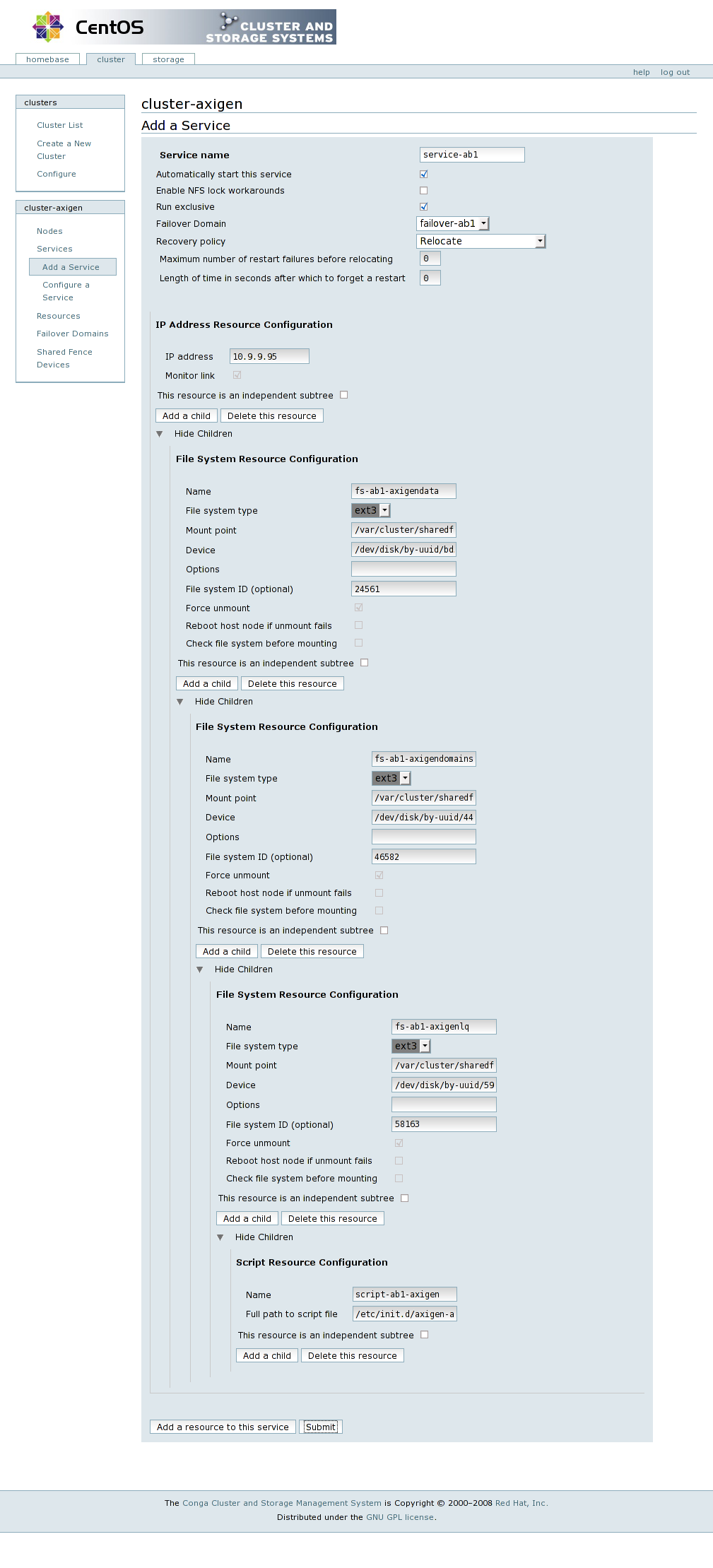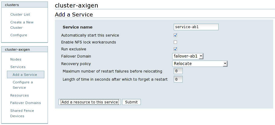 Each failover domain should have a corresponding cluster service configured. In order to create a cluster service, navigate to the Services entry from the cluster name menu and then click on the “Add a Service” option. Name the service prefixed with service-, followed by the failover domain tag, for example service-axib1. Check the Automatically start this service and the Run exclusive options, and then select the corresponding failover domain and set the Recovery policy to Relocate.
