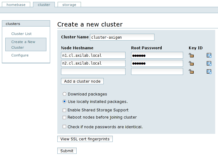 Fill in all the nodes involved in the cluster, along with their root password. Then, select the Use locally installed packages option (we have already installed all the needed cluster packages), and deselect all of Enable Shared Storage Support (we are not using GFS and other shared storage specialized file systems), Reboot nodes before joining cluster (there is no need for this option). The last option Check if node passwords are identical should be checked only if all the nodes involved in the cluster have the same root password and checking it will leave editable only the first node's password, all the other password fields will be grayed out (disabled). Please use a proper naming for the cluster, like cluster-axigen.