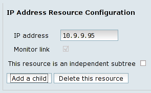 Before creating the cluster service, you need to add its corresponding resources by pressing the Add a resource to this service button for the IP address resource, then create a dependency based tree by subsequently using the Add a child buttons for each of the File system resources. The last resource should be the Script resource, dependent of all the other ones successful startup. This way, no resource is being started without the previous one successful startup.
