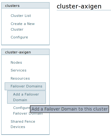 This step consists in creating a failover domain for each pair of active / passive nodes, so that when the active node fails at some point, the passive node takes over the responsibilities. In order to create a failover domain, click on the Failover Domains entry from the cluster name menu and then on the Add a Failover Domain option.