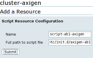 The last resource type that must be added to the cluster is the init script, used to start and stop the Axigen daemon. Each Axigen instance (one per failover domain) should have its own init script resource. To add a script resource, select Script from the resource type drop-down list and fill in the full path of the init script, as you have previously set. The name of the script should be prefixed with script-, followed by the name of the failover domain and the -axigen literal text.