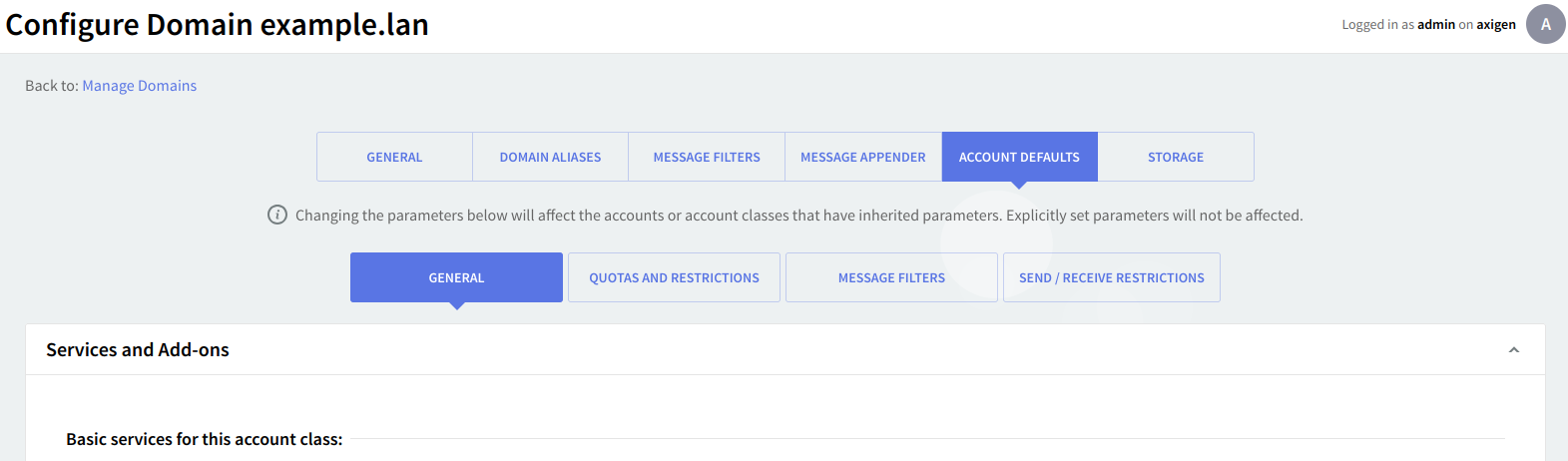 The "Manage Domains" → "Account Defaults" page defines default values for the parameters that will be automatically inherited by all new accounts and account classes and can be explicitly set (overridden) in the advanced configuration of the respective account or account class.