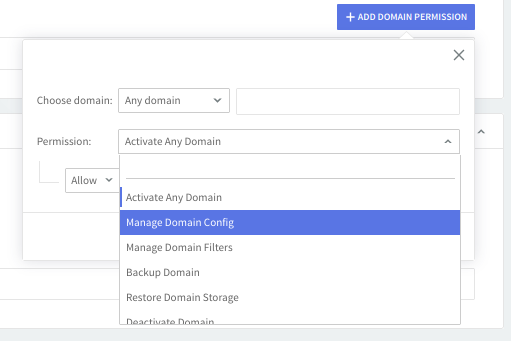 Click on the "Add domain permission" button, then use the available drop-down menus to configure the new permission by choosing the service and action relative to the selected module. Available actions are: "Allow" and "Deny". Hit the "Quick Add" button to finalize the addition of the new configuration.