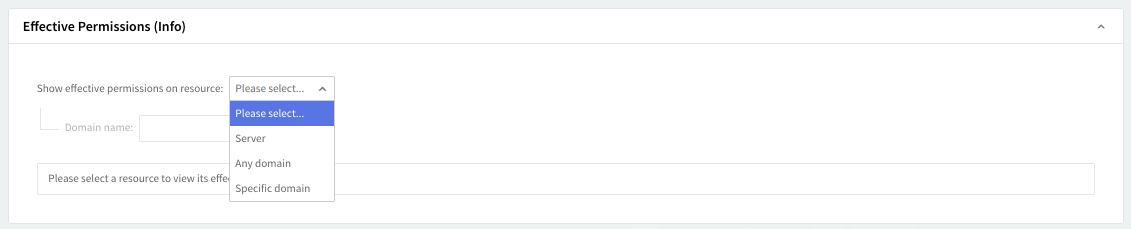 Check the "Effective Permissions" section for complete information about the permissions available for the configured administrative user at different levels (resources): server, any domain, or a specific domain.