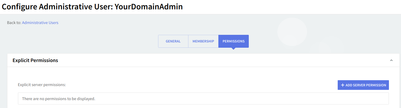 The "Administrative Users" → "Permissions" page allows you to specify the parameters relative to the server and domain permissions for the configured administrative user.
