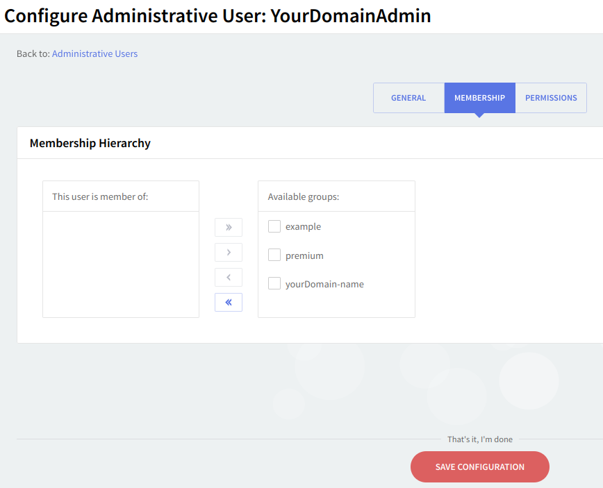 Use the options under the Membership hierarchy to set the hierarchy of the configured administrative user (DomainAdministrator1 in this example). Thus, the configured user can be assigned as a member of the existing available administrative groups or removed from an already existing group list, by using the two arrows.