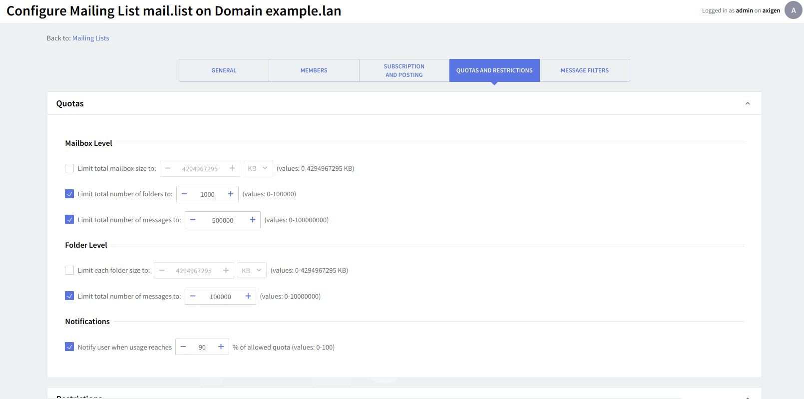 The "Mailing Lists" → "Quotas and Restrictions" page contains parameters relative to parameters at the mailbox and folder level, notifications to be sent to the list members, and restrictions imposed to the mailing list being edited.