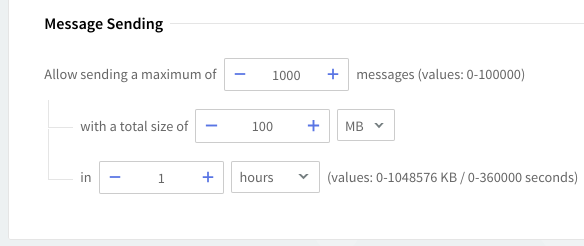 Limits imposed to send messages offer you an easy possibility to prevent account users from generating spam. They can thus limit the total number of messages to be sent and their size in a time interval. Use the up and down arrows to select the desired size or edit the corresponding text field. To have message size calculated in KB, MB, or GB, use the respective drop-down menu.