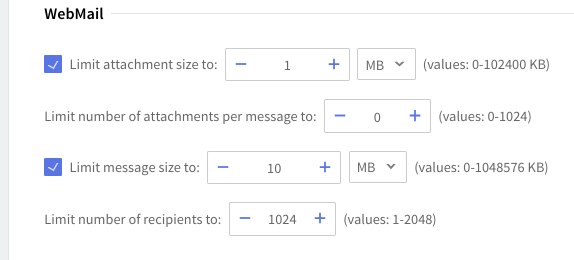 To limit the attachment and message size check the respective options in the WebMail section and use the up and down arrows to select the desired size. To have the size measured in KB, MB, or GB, use the available drop-down menu.