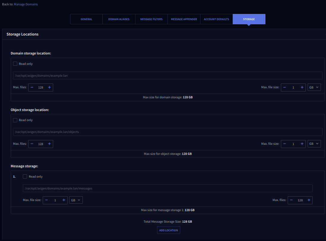 The "Storage Locations" section allows domain administrators to modify their storage file parameters (domain, object, and message stores). Additionally, any of these can be temporarily set to read-only mode for maintenance. New message stores can also be added.
