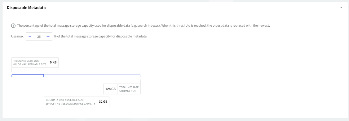 In this section, you have a visual representation of the amount permitted to be used for the metadata information per domain. The totality of the bar represents the entire storage space available for that domain; the white section represents the maximum storage capacity that can be used for metadata information; the blue represents the current storage capacity for the metadata information. You can enforce the maximum percentage of the total available storage space to be used for the metadata information. When this threshold is exceeded the oldest metadata is replaced with the newest.