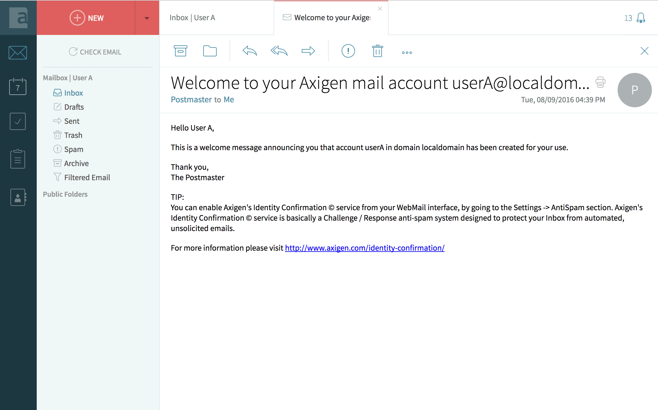 In this example, we have User A (userA@localdomain) who has 1 email in her Inbox.
