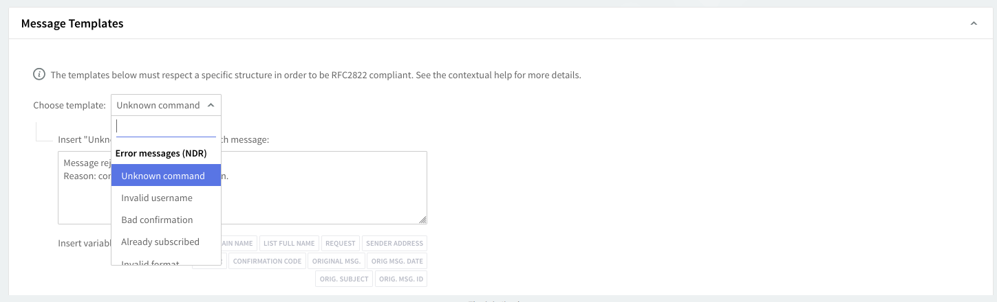 This section enables you to edit the message templates. You can edit the automated responses for error messages (NDR) and RFC2822 reply messages such as confirmation requests, subscription denied, welcome messages, and more. Click the button corresponding to the template you are interested in and make the change in the related text box.
