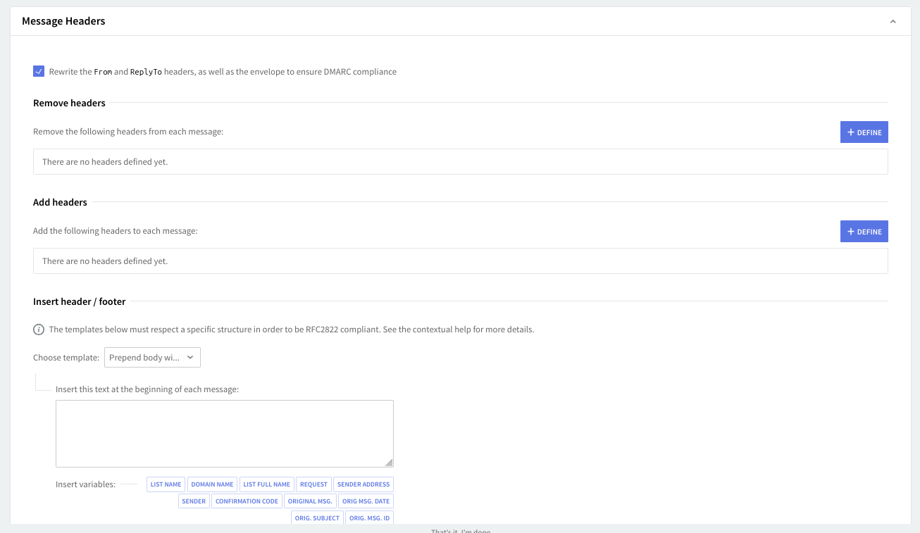 In the "Insert Header / Footer" section you can edit custom content that will be added before/after the message body. Use the predefined variables buttons to automatically insert details related to specific list messages. A list of the variable's significance can be found below: