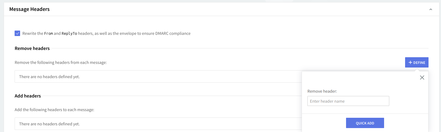Here you can list or modify the headers you wish to remove / add from each message. To edit a header hit the "Edit" button on the right side of its name, to delete it click its respective "Delete" button. Should you like to add a new header to be removed hit the "Define" button.