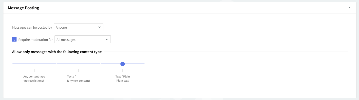 Use the drop-down menu from the Messages that can be posted by field to select who has the right to post messages. Choose one of the three options: Anyone, Subscribers and Moderator, or Moderator Only. Check the Require moderation for choosing what messages should be moderated: all or those from nonsubscribers.