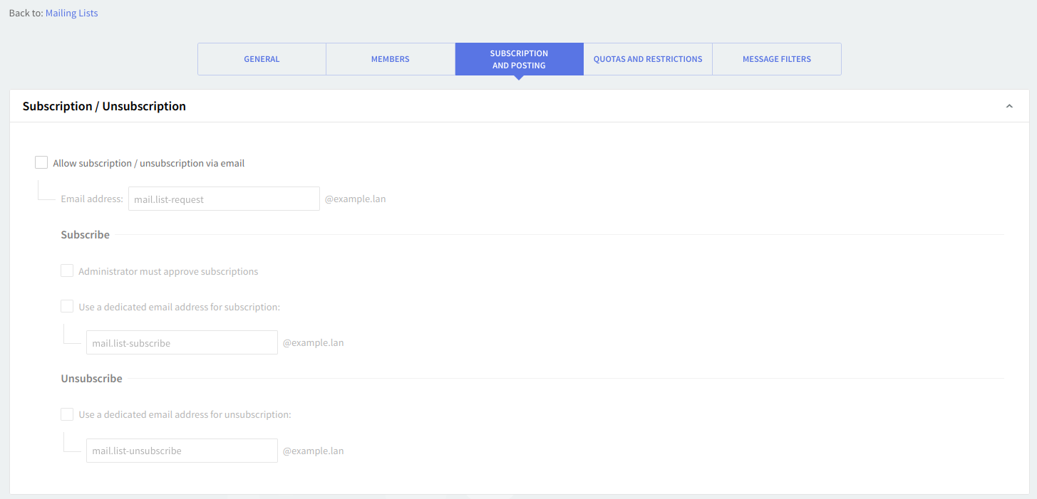 The "Mailing Lists" → "Subscription and Posting" page allows you to set rules regarding subscribing and unsubscribing, posting rights, as well as define message headers and templates for mailing lists.