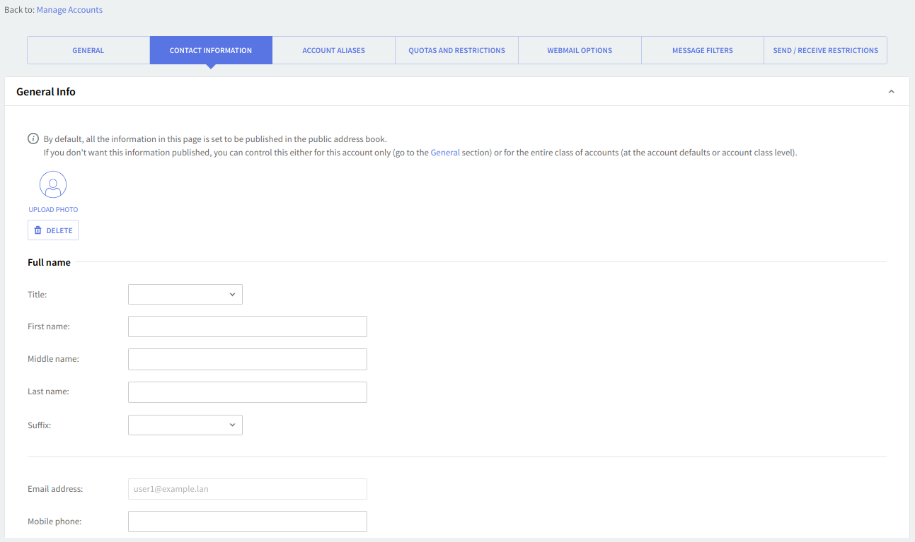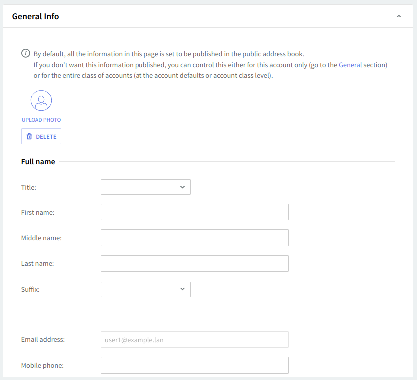In the "General Info" section, you can customize the contact's full name and mobile phone. The email address field is greyed out, as it corresponds to the account name.