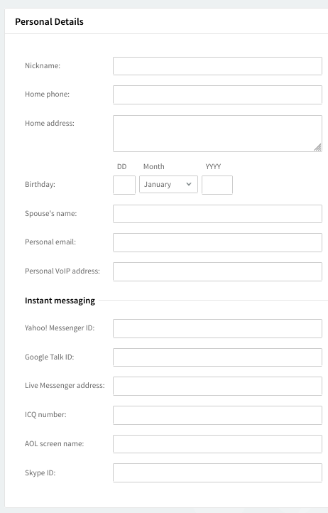 The "Personal Details" section allows the customization of the nickname, home phone and address, birthday, spouse's name, personal email, and VoIP address. Also, general instant messaging account details are available.