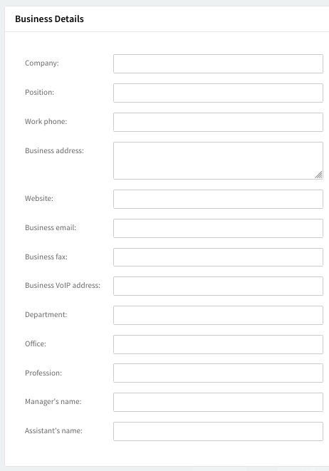 In the "Business Details" section, you can set work-related details such as company, position, work phone, business address, manager's name, and more.