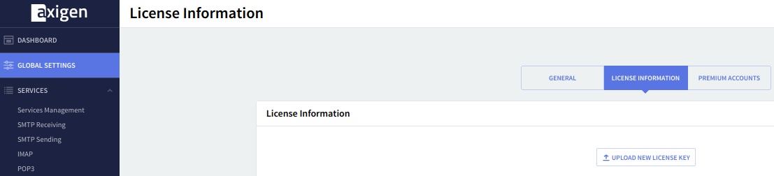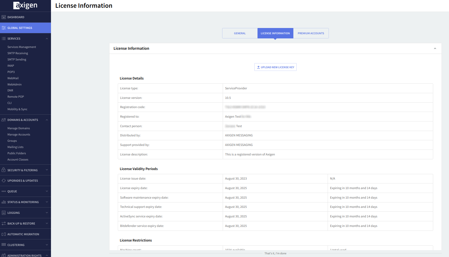After successfully uploading it, which includes an automatic Axigen service restart, all the details relative to the license type — including company, expiry date, version, included add-ons, and different counters for mailboxes, domains, etc. - will be displayed.