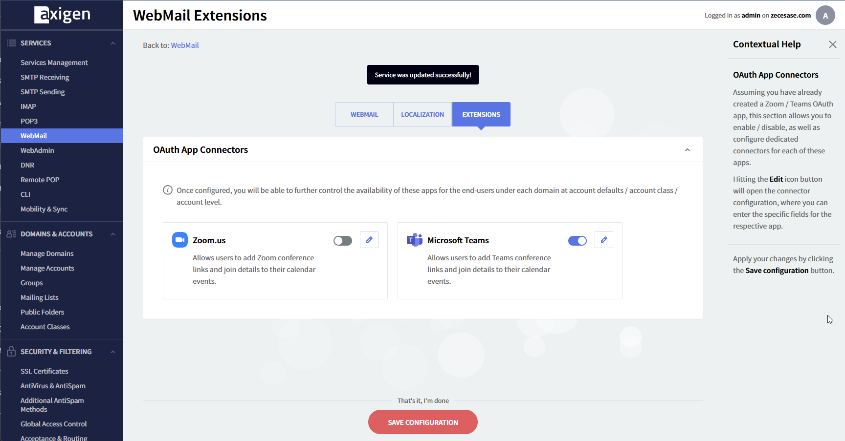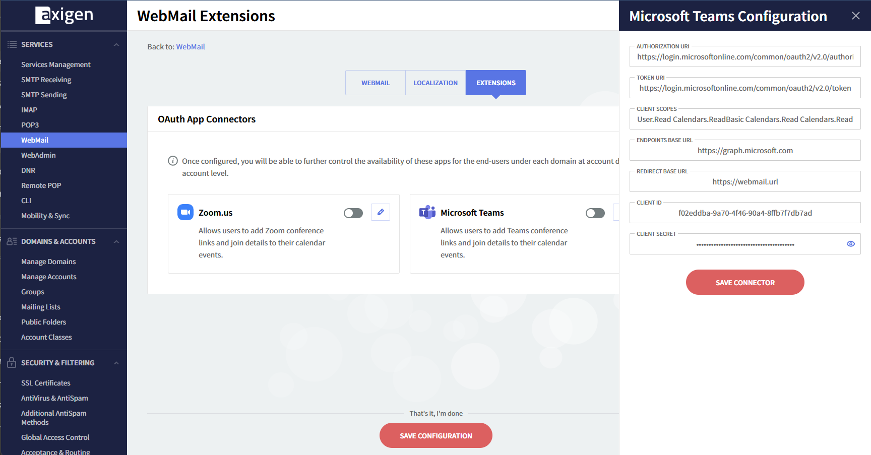 Axigen Preparation: Creating and Configuring the Teams Connector in Axigen