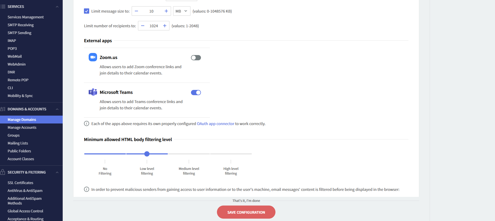 This integration is available starting with Axigen X6 (10.6.0).