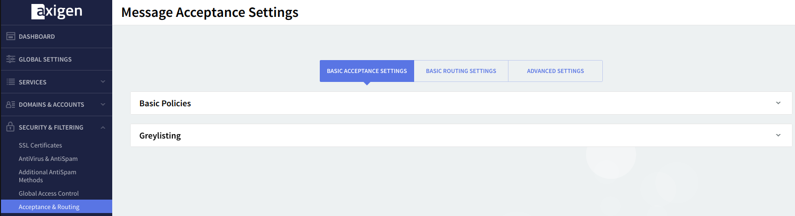Acceptance Basic Settings – contains the basic policies for email acceptance;