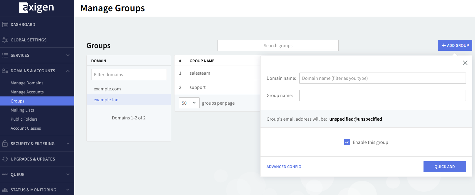 When creating a group, the selected domain is displayed in the "Domain name" field. If no domain has been selected before clicking "Add Group," you will need to choose one. In the "Group Name" field, specify the desired name for the group. Once these details are filled in, the group's email address will be automatically generated(the generic address is groupname@domainname.tld). You can also enable the group by checking the "Enable this group" option before proceeding.