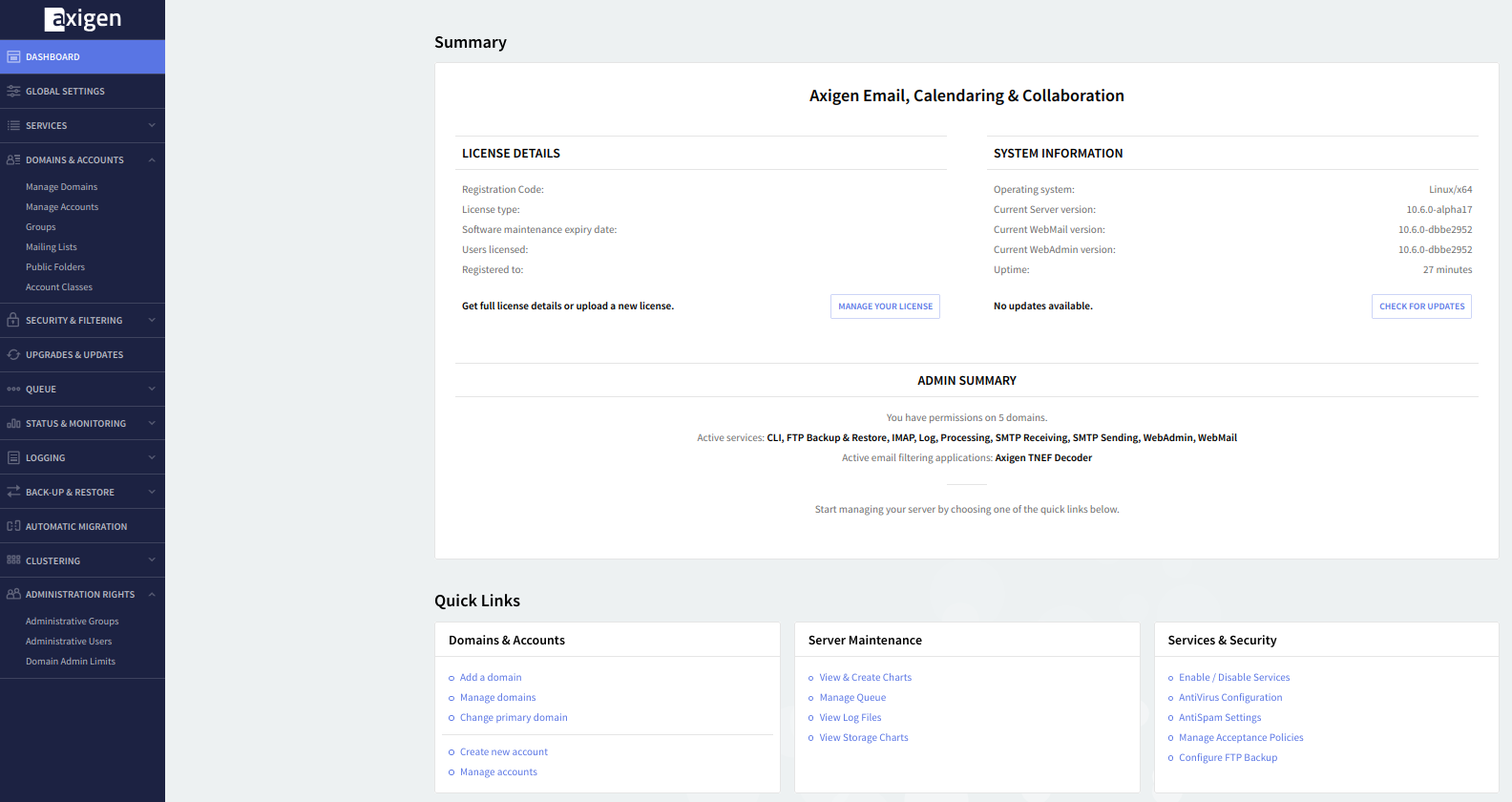 When accessing the WebAdmin interface you will be presented with the Dashboard page which displays a notifications area containing license-related information, server summary, containing the server version, administrative permission, running services, and enabled anti-virus/anti-spam filter information. In the middle part of this section, the "View license info" link provides direct access to the "WebAdmin" → "General Settings" → "License Information" and the "Check for updates" link redirects you to the "Download" section from our website, where the latest Axigen packages are available for download.