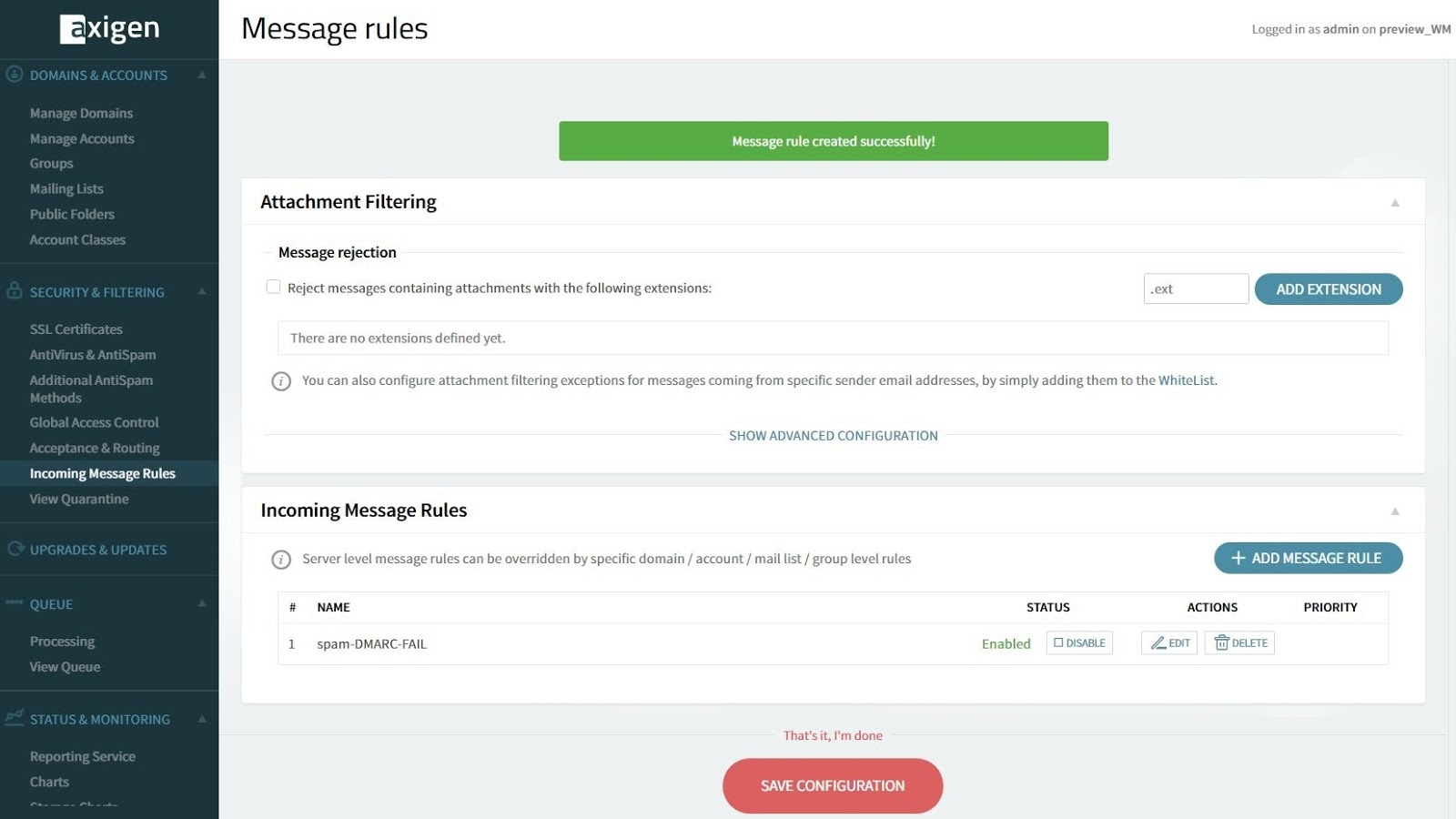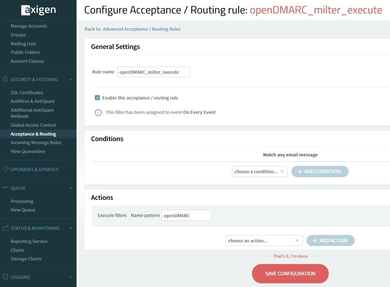 Using the Axigen X3 Update 2 openDMARC integration, you can choose what you want to happen to messages, based on the DMARC policy they’ve been attributed to. You can choose to either reject or quarantine them, or to accept them, but file them in the Spam folder.